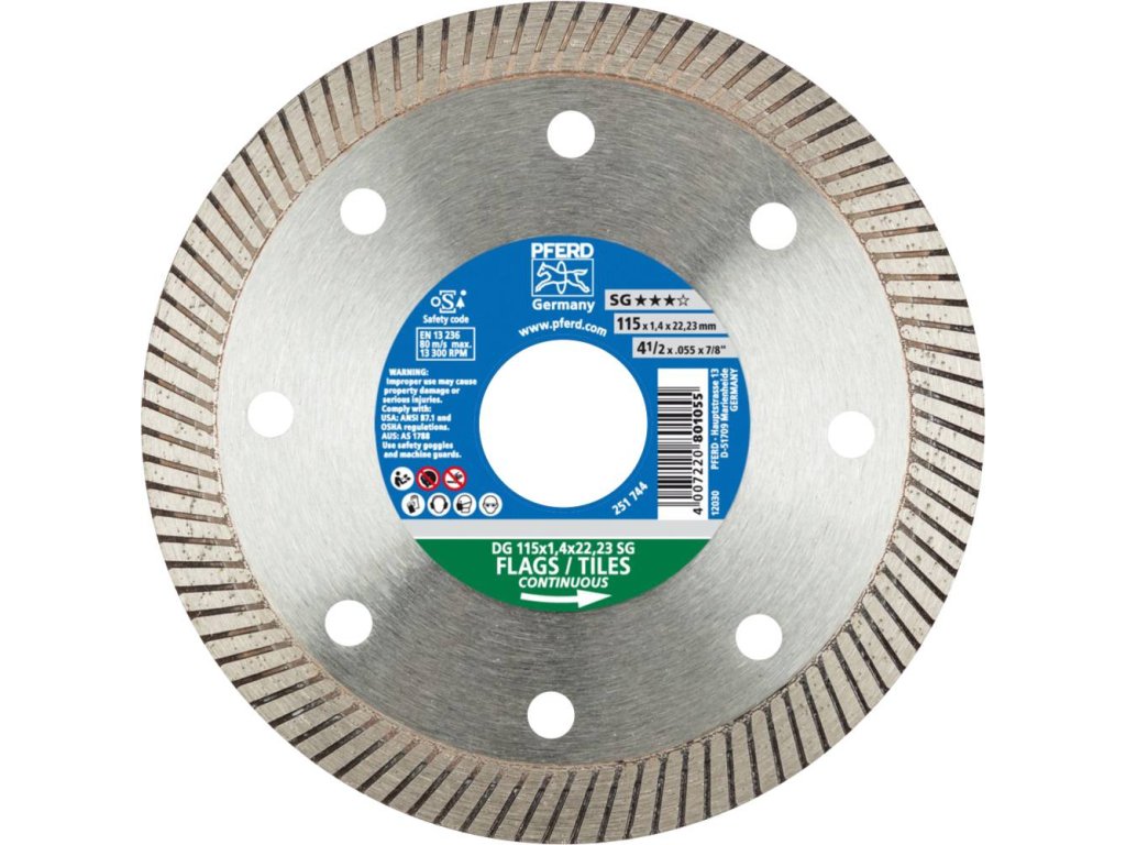 Diamantový plný řezný kotouč PFERD SG FL. Špičkový diamantový kotouč pro řezání obkladů, dlažeb atd. Určeno pro úhlové brusky průměru 115mm. Verze s nepřetržitým okrajem je vhodná pro velmi jemné řezy, např. dlaždic. Pokud je to možné, je třeba upřednostňovat řezání za mokra před řezáním za sucha. Tím se snižuje opotřebení nástroje, riziko tepelného poškození obrobku a vystavení prachu. Řežte pouze s mírným tlakem, aby se zabránilo přehřátí nástroje. Vhodné pro použití na úhlových bruskách všech výkonnostních úrovní.
