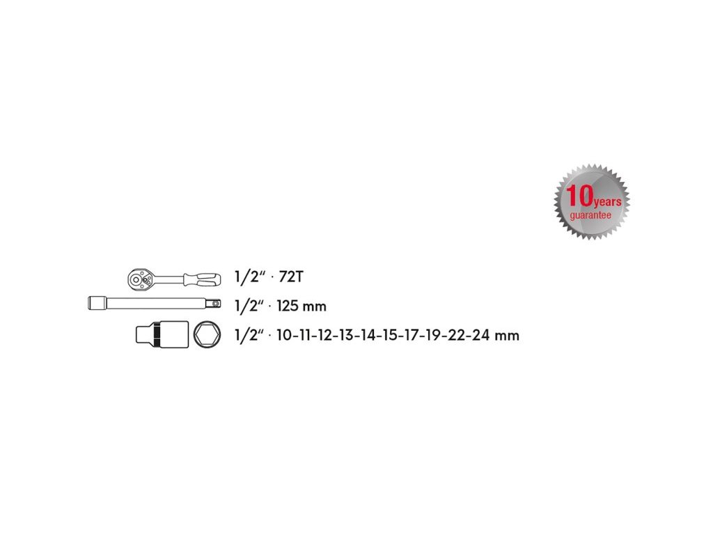 Všechny části jsou vyrobeny z vysoce kvalitní chrom-vanadiové oceli, ráčny mají jemné dělení 72 zubů s přepínací páčkou a uvolňovacím tlačítkem, tělo ráčny z CrV oceli, zubový mechanismus z S2 oceli.