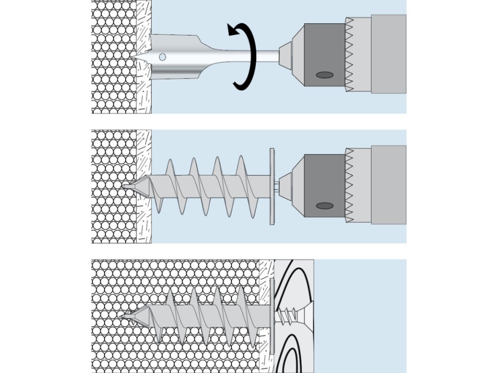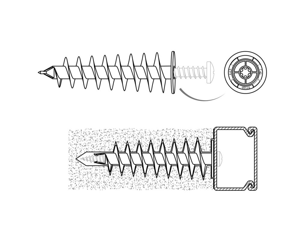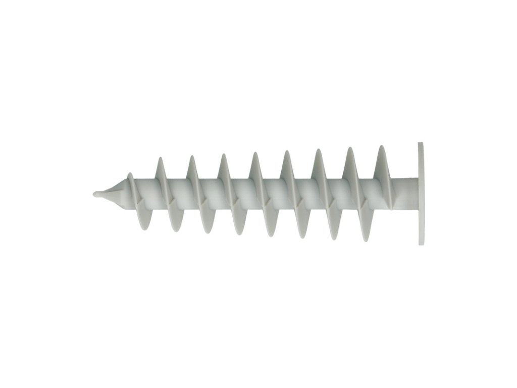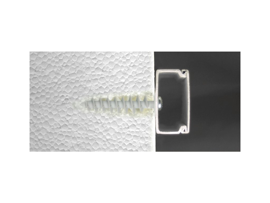 - Hrubý spirálový závit hmoždinky se snadno zavrtává do izolace bez poškození izolačního panelu