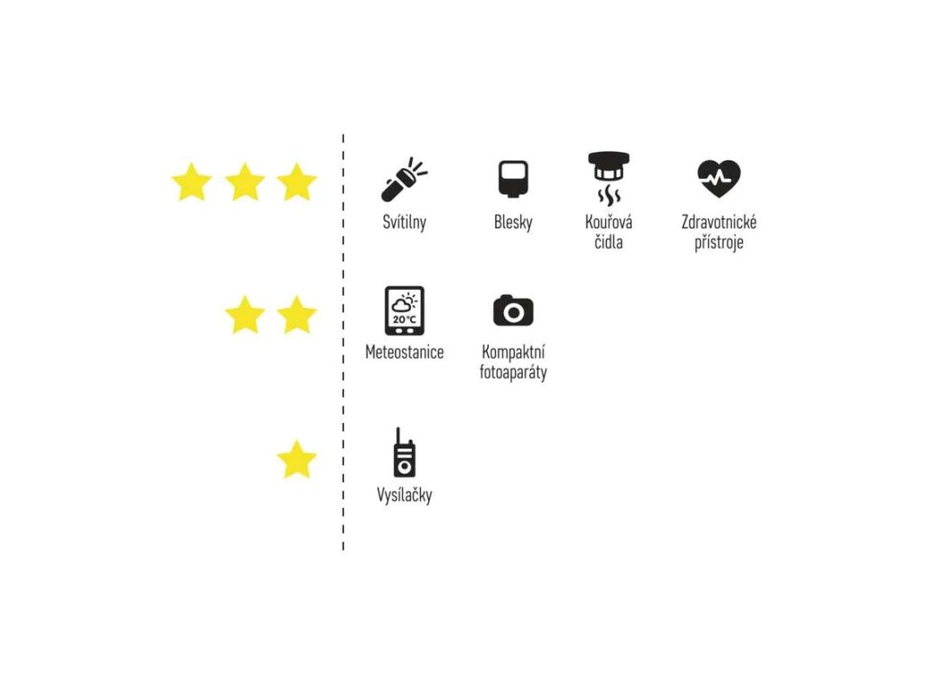 Vhodná pro digitální fotoaparáty a blesky, elektronické hračky, zdravotnické pomůcky a přístroje, hobby modely, přehrávače MP3, PDA a příruční GPS. Extrémně dlouhá skladovatelnost až 10 let.