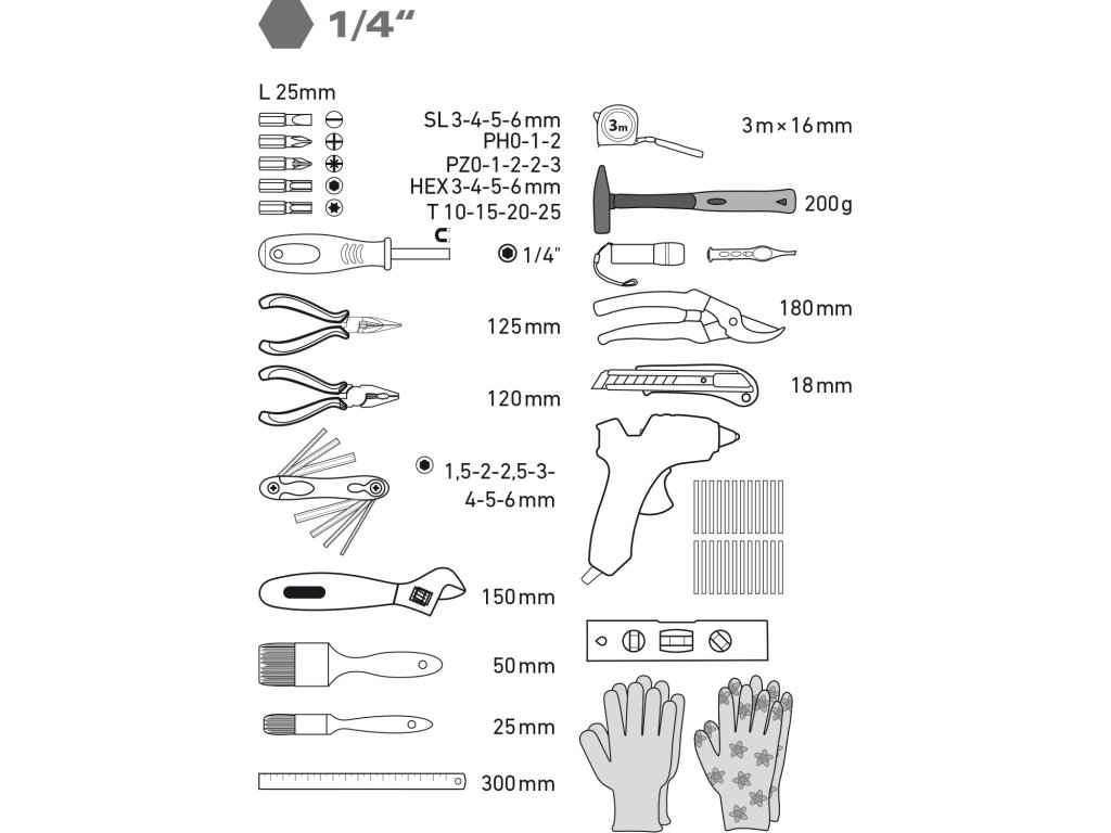 - ostatní díly:štětce ploché šířka 25 a 50mm, ocelové pravítko 300mm, vodováha 170mm, svítilna LED 60lm, pinzeta s LED světlem, pistole tavná pr.7,2mm 25W, tyčinky tavné pr. 7,2mm 12ks-mix barev a 12ks-transparentní