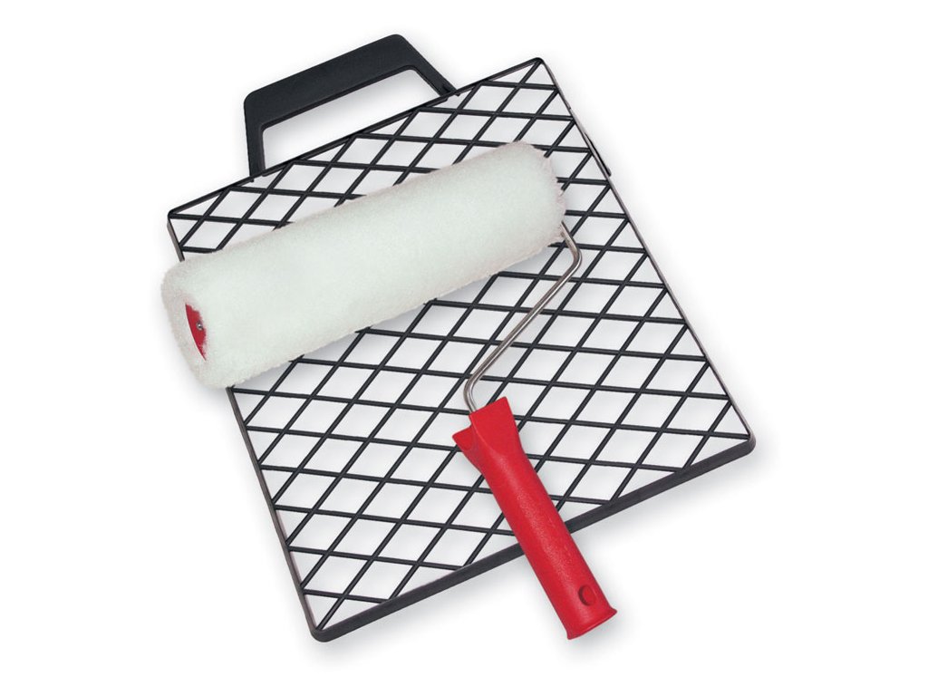 Souprava pro malířské a lakýrnické práce obsahující váleček, držadlo a mřížku.