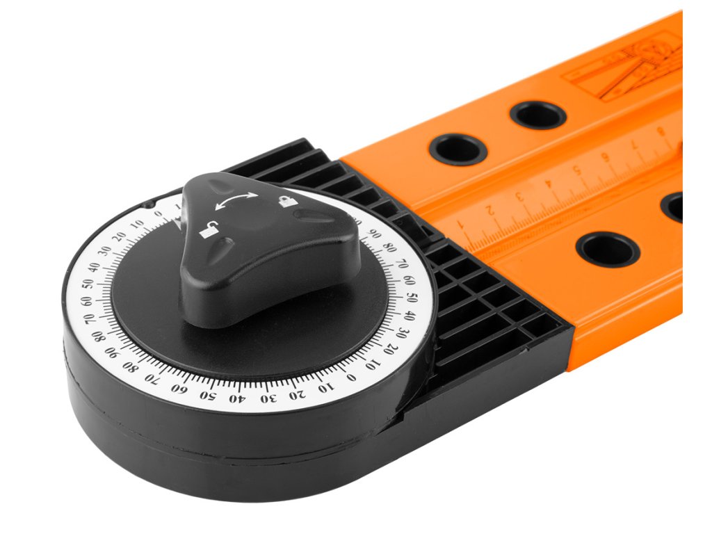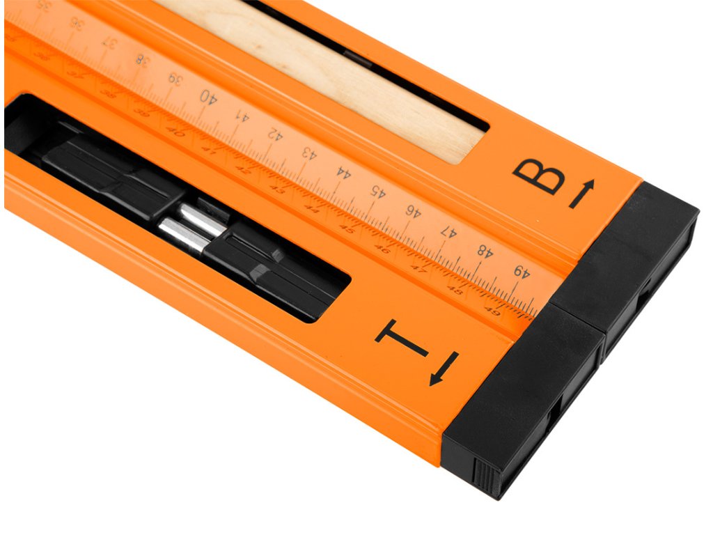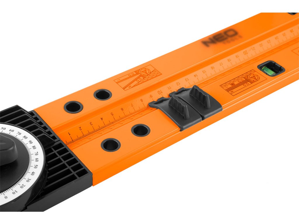 Má úhloměr s rozsahem měření 0°- 270°, 500 mm dlouhou vodováhu se dvěma libelami, 50 cm dlouhý lineární metr, možnost připevnění tesařské tužky, takže jej lze použít jako kompas.