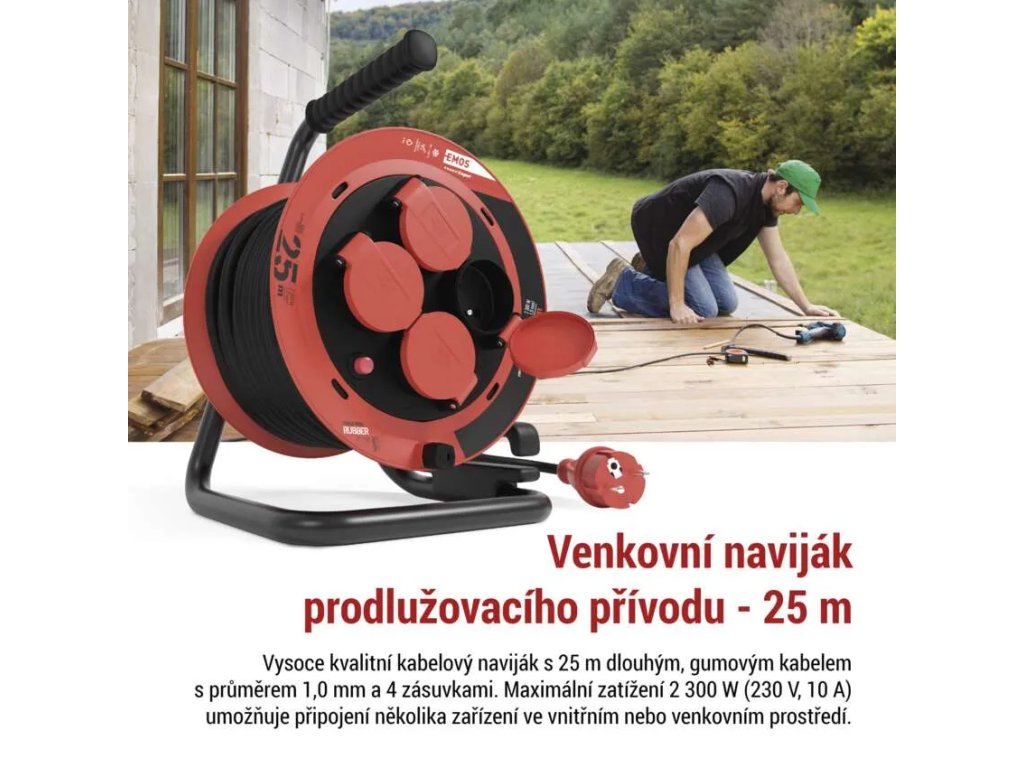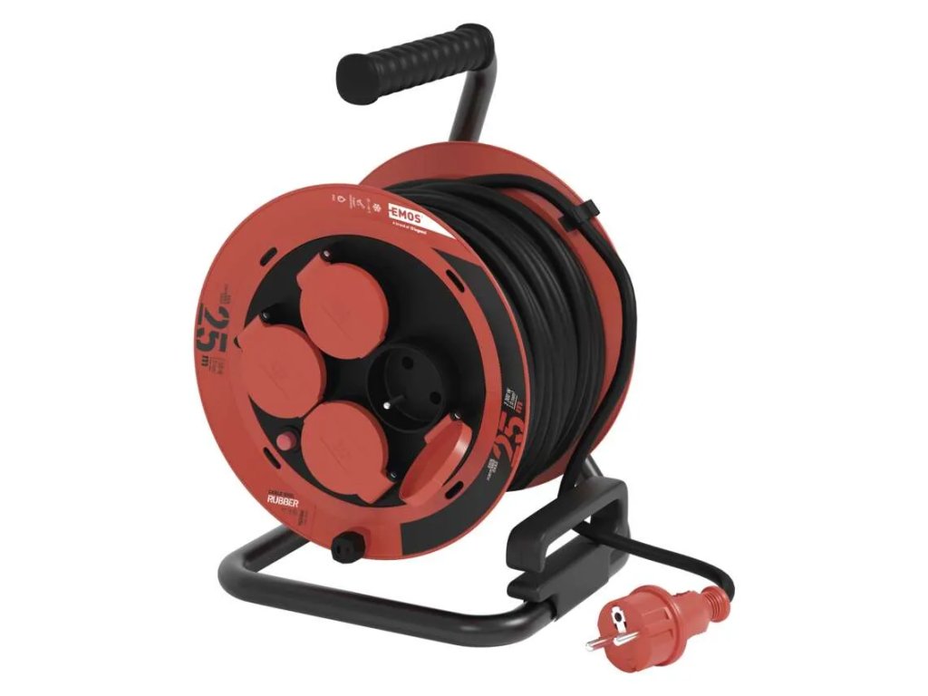 Venkovní prodlužovací kabel na bubnu 25m, 4 zásuvky, guma, 230V, 1,0mm2, IP44